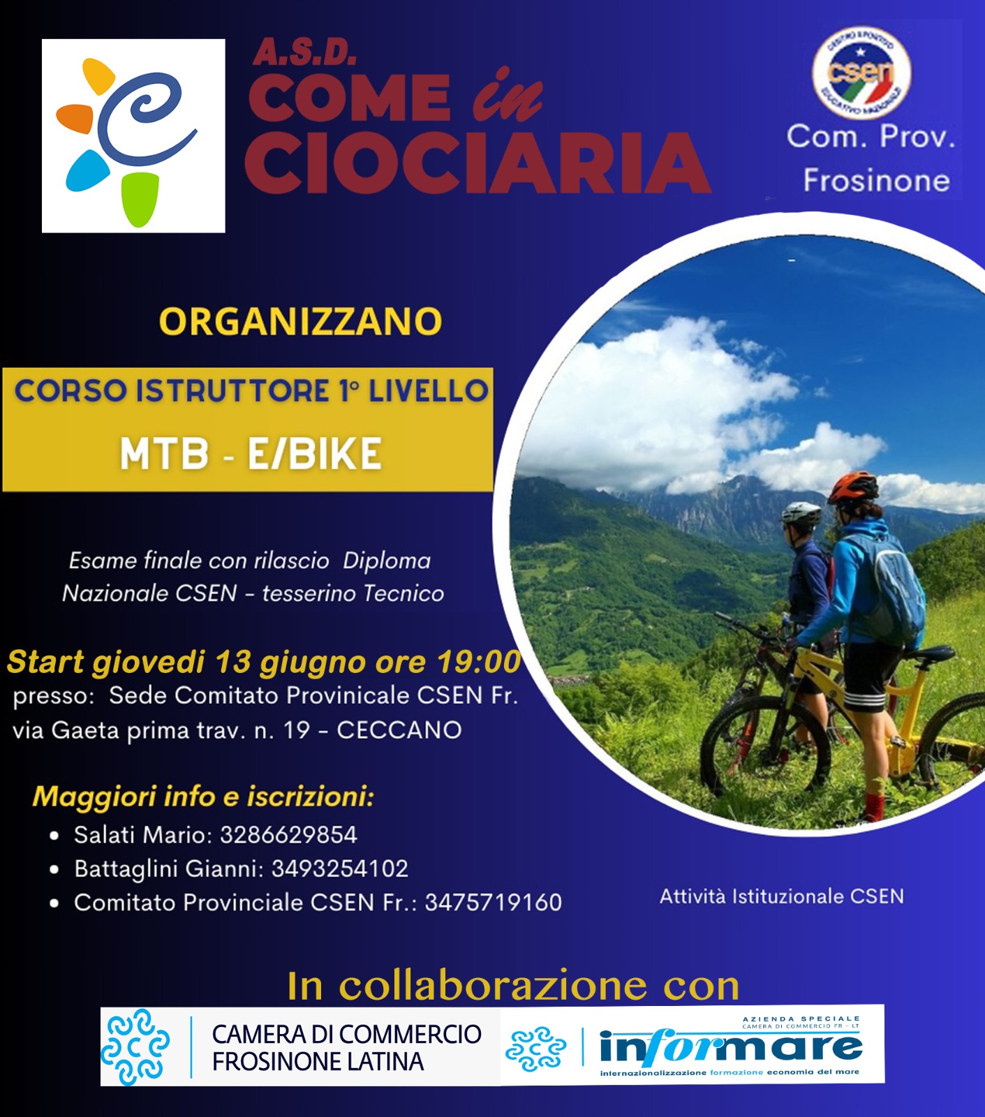 L A.s.d. Comeinciociaria e la C.S.E.N. di Frosinone, in collaborazione della Camera Commercio di Frosinone e Latina e dellazienda speciale Informare, organizzano il corso per Istruttore/Accompagnatore Cicloturismo Mountain Bike . Il corso strutturato in lezioni teoriche e pratiche con lobiettivo formativo per fornire a coloro che desiderano intraprendere e realizzare possibilit lavorative, amatoriale, e professionale per le discipline del Cicloturismo - Mountain Bike.